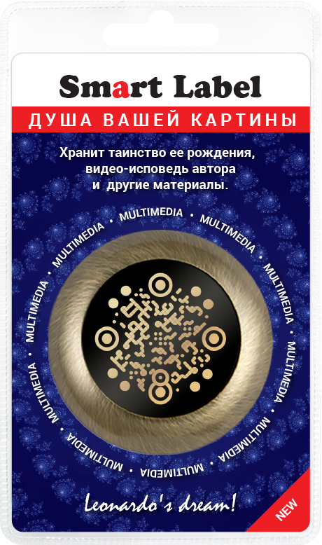 Цифровое клеймо Smart Label – уникальный продукт для художников, архитекторов и дизайнеров. Предназначено для наделения картины/арта способностью записывать на них документальный процесс создания произведения, видео-исповедь автора и другую информацию. Данная технология позволяет обеспечить новый канал коммуникации автора со зрителями, значительно повышает привлекательность и коммерческую ценность произведения.
